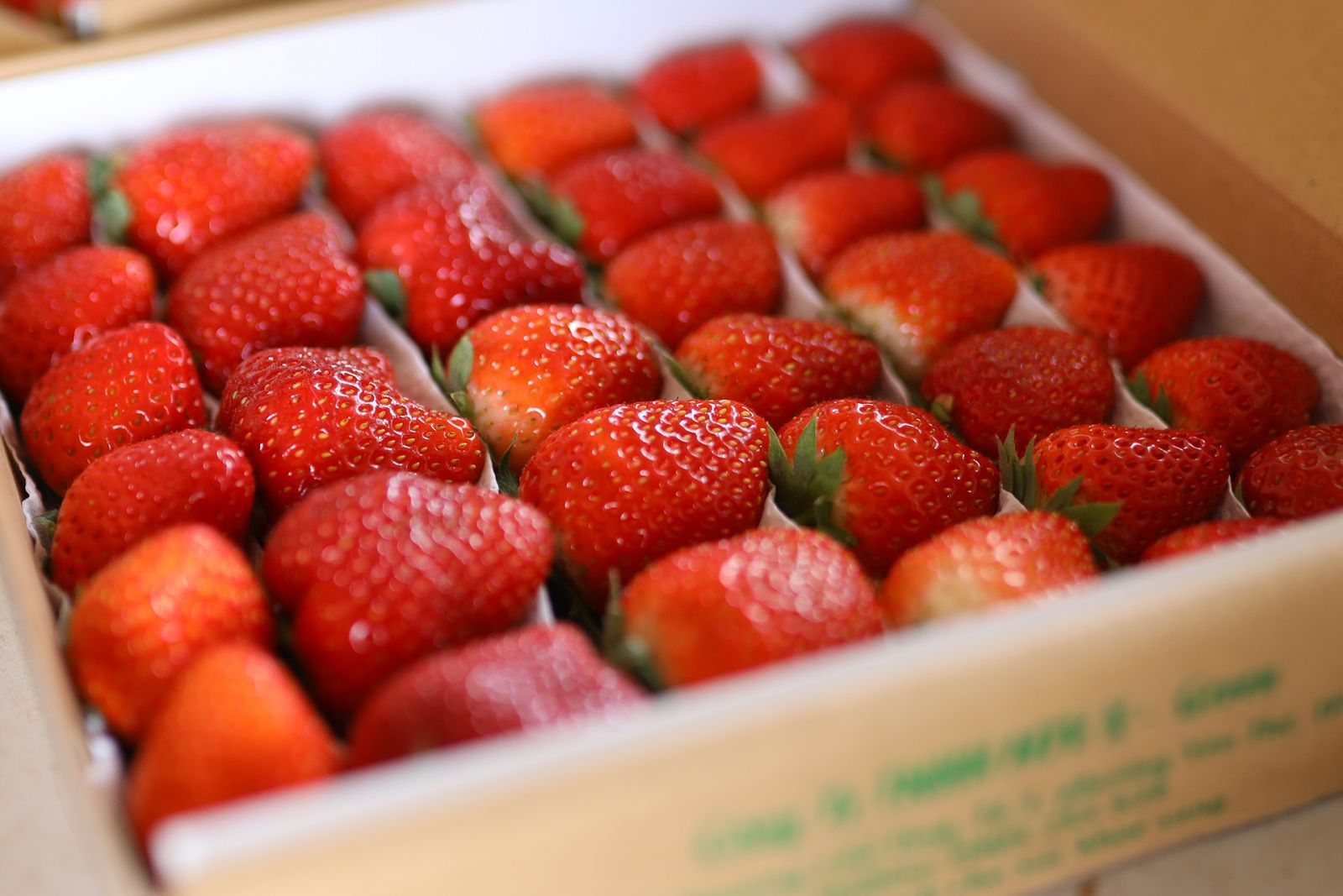 Dâu nhật ngọt size vip từ 50 - 60 quả/kg Quy cách đóng gói: hộp giấy 500 g.